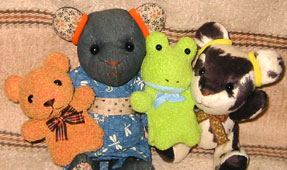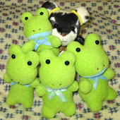 ろばろば亭のカッツ君や、ぬいざんまいのけろよんた君が大活躍してるのが羨ましくって、かえるの日に間にあうように、くま・ぱあくにも、かえる仲間を作ってもらったんだ。