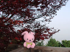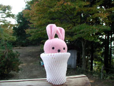 3.もたて山見晴台 「この日はかすんでいて、遠くまで見えなかったけど、ここの紅葉は真っ赤だったんだ。」 「リーゼント風にしてみたよ。似合う?耳の後ろにひっつきむしをつけているんだ。」(どんどん) |