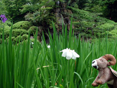 | 「菖蒲が満開の『無憂園』には、 小さな滝もあるんだよ。」 |