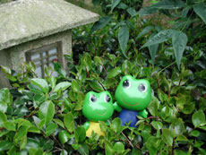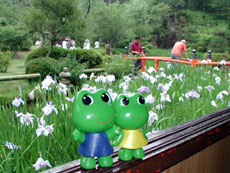 | 初お出かけのケロとコロ 「やた!菖蒲の花が満開だ!」 |