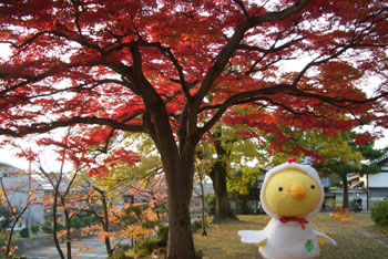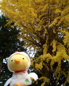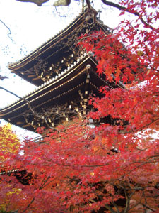 26.真如堂の西側にある石段を登って、宗忠神社へ。 立派なイチョウの木。 「このあと、吉田山を越えて、東山通りに抜けたんだ。蹴上駅からずっと歩き通し。拝観料のいるところはどこにも入らずに、紅葉を満喫できたんだって。」 |