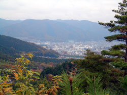 急な坂を登ると、市街地が見渡せる場所に出る。 この先は、見晴らしがよくない山道なので、鳥さんの鳴き声を聴きながら、もくもくと歩く。 |