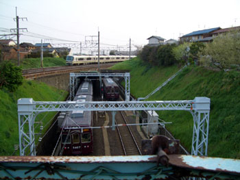 山崎駅より少し京都寄りで、JR京都線と阪急電鉄京都線が交差している。 手前が阪急、奥がJRの車両。 |