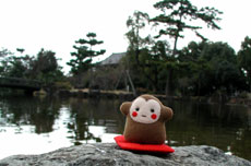 「くま・ぱあく」の凛さん作のぬいぐるみ。 翌年が申年ということで、2003年クリスマスにうちにやってくる。 奈良公園で撮影(2003.12)。 |