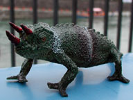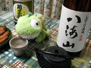 1990年頃クリスマスプレゼントとして、うちに最初にやってきたカメレオン。 「ねこまさらんど」のねこまさ君おすすめ「八海山」を飲んで、ご機嫌のカメ(2003.1 撮影)。 |